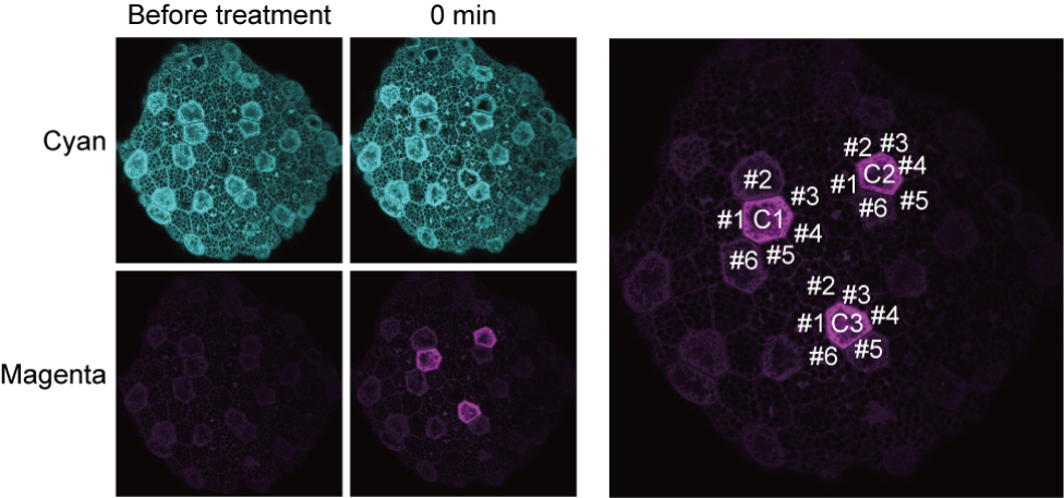 Fig 3: Single-cell photo-conversion. Photo-conversion was induced in three different Marchantia epiderma cells. The fluorescent intensity changes in the induced cell and the surrounding cells were measured to determine the movement of fluorescent proteins.