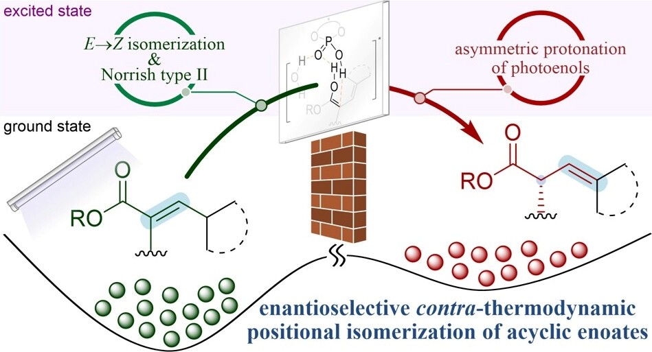 英文: 1-Alkyl-2,3-alkenyl esters (α-alkyl β,γ-alkenyl esters) are important monomers in the architecture of complex biomolecules and serve as key intermediates in the total synthesis of natural products. Their unique structural and reactive features motivated us to develop new synthetic methodologies for their preparation. Conventional asymmetric synthesis approaches often require harsh reaction conditions or employ environmentally unfriendly metal reagents for chiral induction, making it challenging to precisely control the stereoselectivity at the ester α-carbon. To address these challenges, we adopted an anti-thermodynamic photocatalytic strategy for the synthesis of 1-alkyl-2,3-alkenyl esters. Under ultraviolet irradiation, α,β-unsaturated esters underwent a Norrish type II rearrangement to generate the corresponding enols, which subsequently underwent a 1,3-proton transfer promoted by a chiral phosphoric acid, thereby constructing the desired asymmetric 1-alkyl-2,3-alkenyl esters. Using this approach, we successfully synthesized over 50 examples, achieving enantiomeric excesses of up to 96%. Furthermore, we applied this methodology to the formal synthesis of a γ-butyrolactone-type marine metabolite. Furthermore, we demonstrated that the catalytic-scale reaction could be scaled up to gram quantities via a photo-flow technique, while maintaining excellent stereoselectivity (up to 92% ee), highlighting the potential of this strategy for future industrial applications.